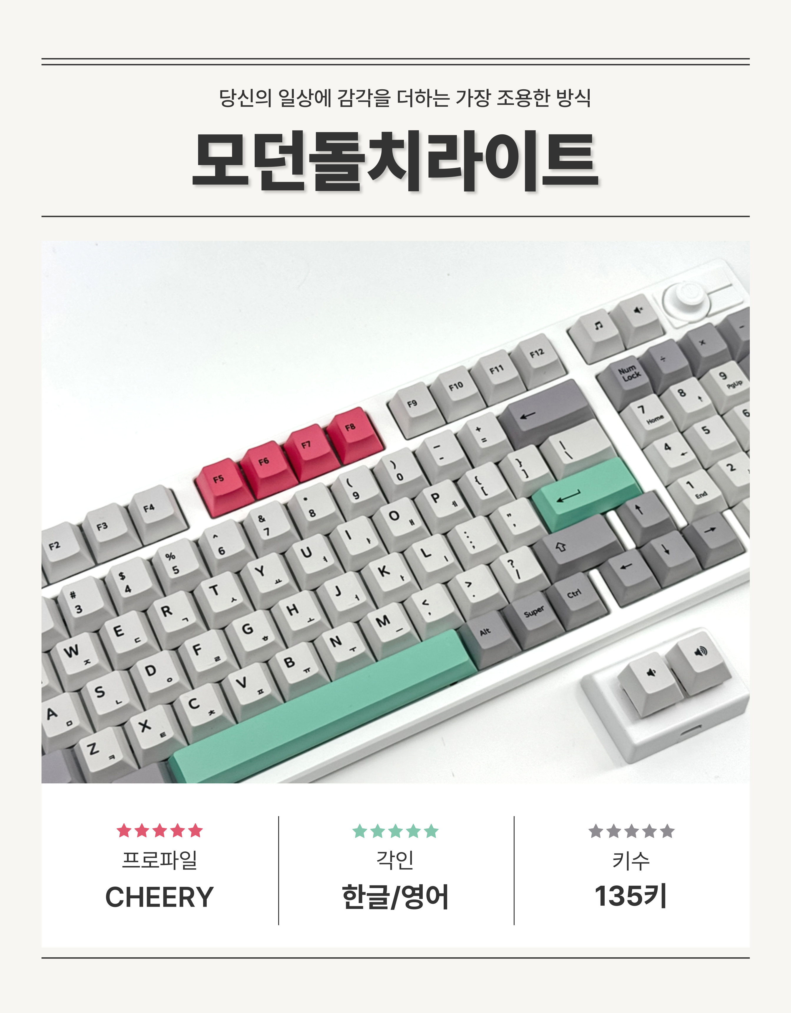> 자체제작 1.7mm 체리 모던돌치라이트 한글 영어 키캡 PBT 5면 염료승화 독거미 (135키)